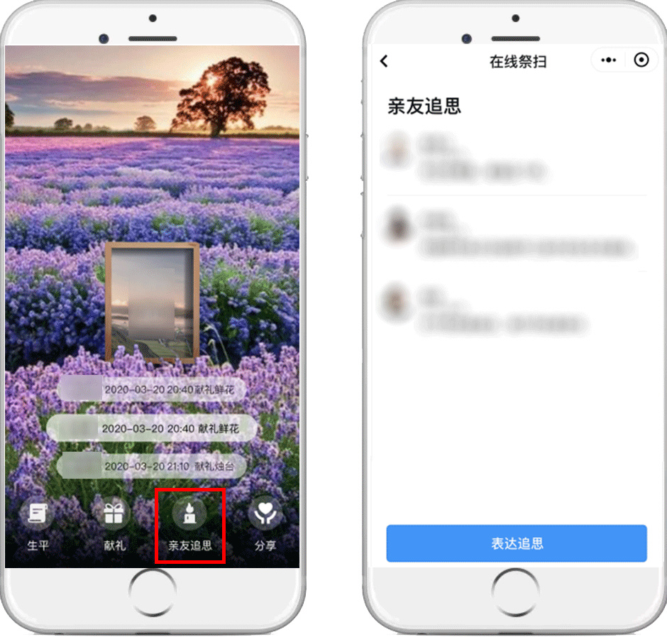2.獻禮 點擊“獻禮”即可向親友獻花、獻酒表達哀念之情。 3.親友追思 親友還可以點擊右下角的“親友追思”,發(fā)表文字表達追思。 4.分享 點擊“分享”,即可分享鏈接給親友,邀請遠方親友一起緬懷先人。