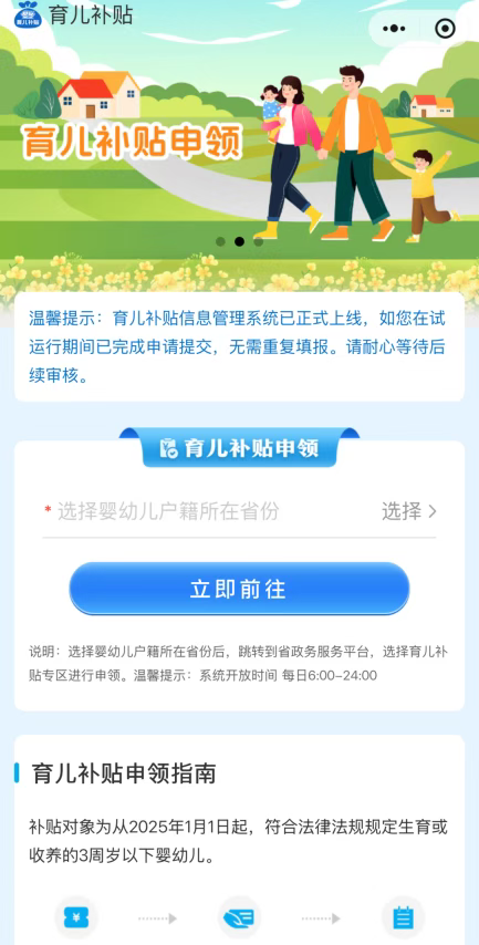 育兒補(bǔ)貼制度從2025年1月1日起實(shí)施,補(bǔ)貼對象為符合法律、法規(guī)規(guī)定生育的3周歲以下嬰幼兒,至其年滿3周歲。育兒補(bǔ)貼按年發(fā)放,現(xiàn)階段國家基礎(chǔ)標(biāo)準(zhǔn)為每孩每年3600元。 育兒補(bǔ)貼不分城鄉(xiāng)、民族、區(qū)域,也不分一孩、二孩或者三孩,實(shí)現(xiàn)三孩生育政策下家庭支持的全面覆蓋,確保符合條件的嬰幼兒能夠平等享受補(bǔ)貼的待遇。 其中,對2025年1月1日之前出生、不滿3周歲的嬰幼兒,按應(yīng)補(bǔ)貼月數(shù)折算計(jì)發(fā)補(bǔ)貼。2022年1月1日以后出生的符合條件的嬰幼兒,都可以領(lǐng)取育兒補(bǔ)貼。 02 育兒補(bǔ)貼申領(lǐng)以家庭為單位,由申領(lǐng)家庭確定1名申領(lǐng)人,應(yīng)當(dāng)是嬰幼兒父母一方,特殊情況下也可以是其他監(jiān)護(hù)人。 育兒補(bǔ)貼發(fā)放渠道為申領(lǐng)人或者嬰幼兒的銀行卡或其他金融賬戶。 育兒補(bǔ)貼信息管理系統(tǒng)和公安、民政、人力資源社會保障等部門建立了信息共享機(jī)制,實(shí)現(xiàn)大數(shù)據(jù)比對校核。 申領(lǐng)時(shí)只需提交嬰幼兒出生醫(yī)學(xué)證明、戶口簿等證明嬰幼兒身份和撫養(yǎng)關(guān)系的必要材料。 財(cái)政部、國家稅務(wù)總局日前發(fā)布公告,對按照育兒補(bǔ)貼制度規(guī)定發(fā)放的育兒補(bǔ)貼免征個(gè)人所得稅,自2025年1月1日起施行。 公告稱,衛(wèi)生健康部門與財(cái)政部門、稅務(wù)部門建立信息共享機(jī)制??h級衛(wèi)生健康部門按規(guī)定為申領(lǐng)補(bǔ)貼的人員辦理個(gè)人所得稅免稅申報(bào)。 按照國家統(tǒng)一部署,廣東省育兒補(bǔ)貼申領(lǐng)從2025年9月8日起正式全面開放。可通過微信、支付寶或“粵省事”政務(wù)服務(wù)平臺線上申領(lǐng),搜索“育兒補(bǔ)貼”即可找到官方小程序。也可到嬰幼兒戶籍地的鄉(xiāng)鎮(zhèn)政府、街道辦事處現(xiàn)場申領(lǐng)。育兒補(bǔ)貼信息管理系統(tǒng)上線后將全年開放,申領(lǐng)人可在規(guī)定的申領(lǐng)年度內(nèi)任意時(shí)間提交申請。 以微信為例,在微信小程序搜索“育兒補(bǔ)貼”,在小程序首頁輸入嬰幼兒戶籍所在省份,點(diǎn)擊“立即前往”,即可跳轉(zhuǎn)至官方政務(wù)服務(wù)平臺,按頁面提示填寫相關(guān)資料并提交申請領(lǐng)取育兒補(bǔ)貼。 近期,不少已經(jīng)申請補(bǔ)貼的 廣東網(wǎng)友表示:已到賬! 還沒申請的寶爸寶媽們 記得抓緊行動起來哦~ 溫馨提示: 大家根據(jù)自身實(shí)際情況自主選擇辦理渠道,但無論線上線下,都須認(rèn)準(zhǔn)官方渠道,謹(jǐn)防被騙。