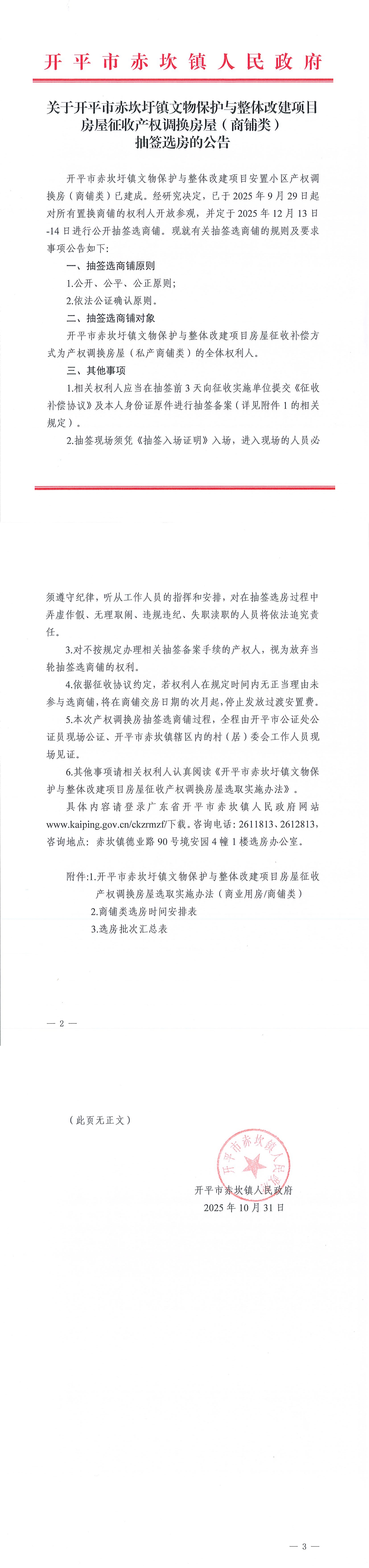 開平市赤坎圩鎮(zhèn)文物保護(hù)與整體改建項(xiàng)目安置小區(qū)產(chǎn)權(quán)調(diào)換房(商鋪類)已建成。經(jīng)研究決定,已于2025年9月29日起對(duì)所有置換商鋪的權(quán)利人開放參觀,并定于2025年12月13日-14日進(jìn)行公開抽簽選商鋪。現(xiàn)就有關(guān)抽簽選商鋪的規(guī)則及要求事項(xiàng)公告如下: