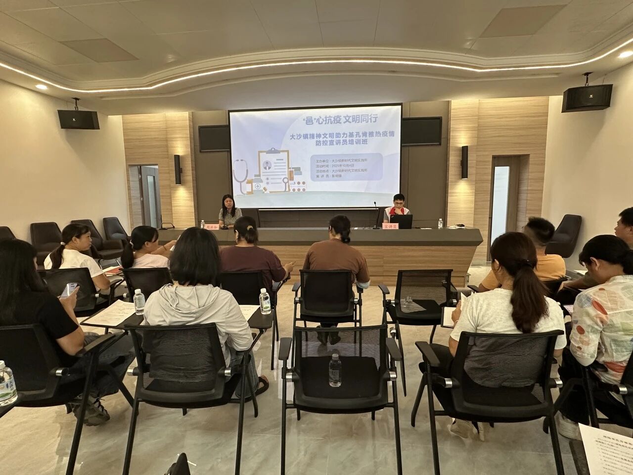 為進一步提升廣大干部群眾疫情防控意識,掌握疫情防控知識,形成疫情防控自覺,大沙鎮(zhèn)新時代文明實踐所協(xié)同鎮(zhèn)各文明實踐站組建鎮(zhèn)村兩級防疫宣講團,并于10月4日舉辦精神文明助力基孔肯雅熱疫情防控宣講培訓(xùn)班,進一步提升宣講員宣講能力水平。鎮(zhèn)黨委委員周冰如主持培訓(xùn)。
