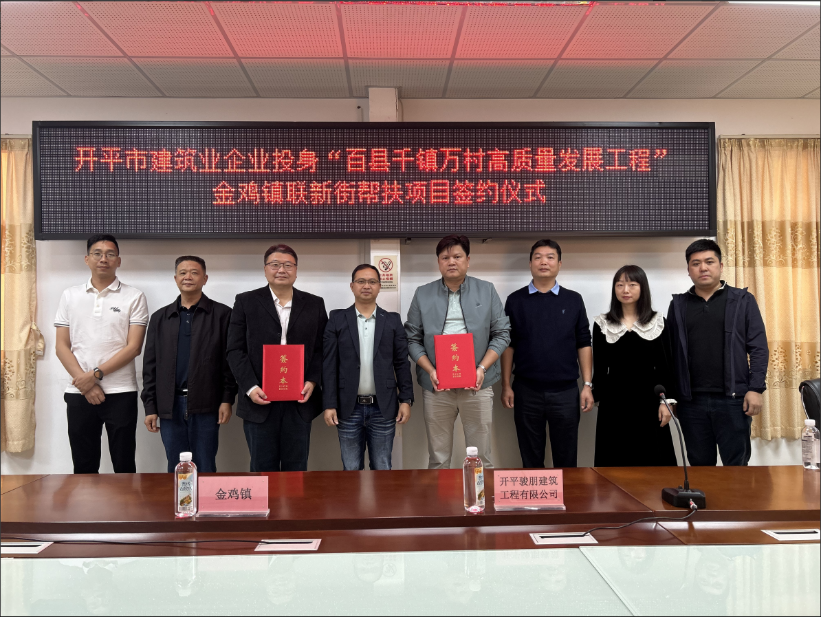 為深入貫徹省委“百縣千鎮(zhèn)萬(wàn)村高質(zhì)量發(fā)展工程”工作部署,落實(shí)市委相關(guān)工作要求,組織建筑業(yè)企業(yè)投身“百縣千鎮(zhèn)萬(wàn)村高質(zhì)量發(fā)展工程”,11月26日,金雞鎮(zhèn)與開(kāi)平駿朋建筑工程有限公司舉行幫扶項(xiàng)目簽約儀式。金雞鎮(zhèn)領(lǐng)導(dǎo)班子成員以及建筑企業(yè)代表出席簽約儀式。