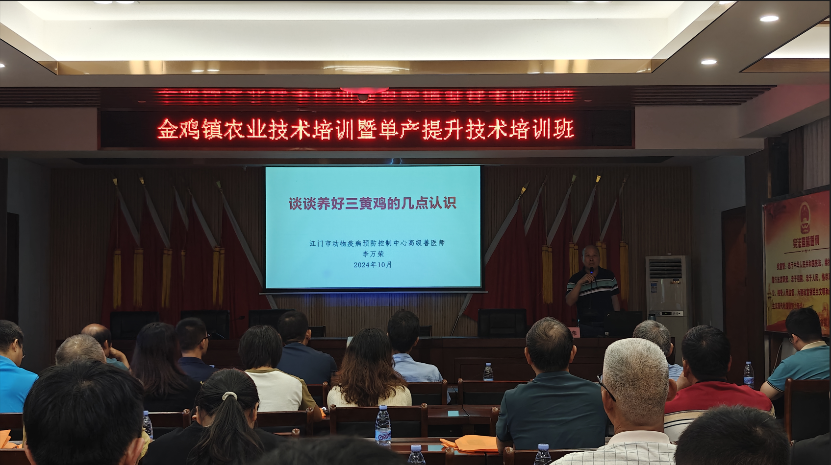 培訓(xùn)會(huì)上,江門(mén)市動(dòng)物疫病預(yù)防控制中心高級(jí)獸醫(yī)師李萬(wàn)榮用通俗易懂的語(yǔ)言,深入淺出地為大家講解了三黃雞養(yǎng)殖的技術(shù),重點(diǎn)圍繞三黃雞的品種特點(diǎn)、散養(yǎng)方法、圈舍選址與構(gòu)建原則、種蛋的精選與消毒流程、孵化期間的照蛋與落盤(pán)技巧、雞苗的飼養(yǎng)管理要點(diǎn)、疾病預(yù)防策略以及成本核算等環(huán)節(jié)進(jìn)行了詳盡的講解。