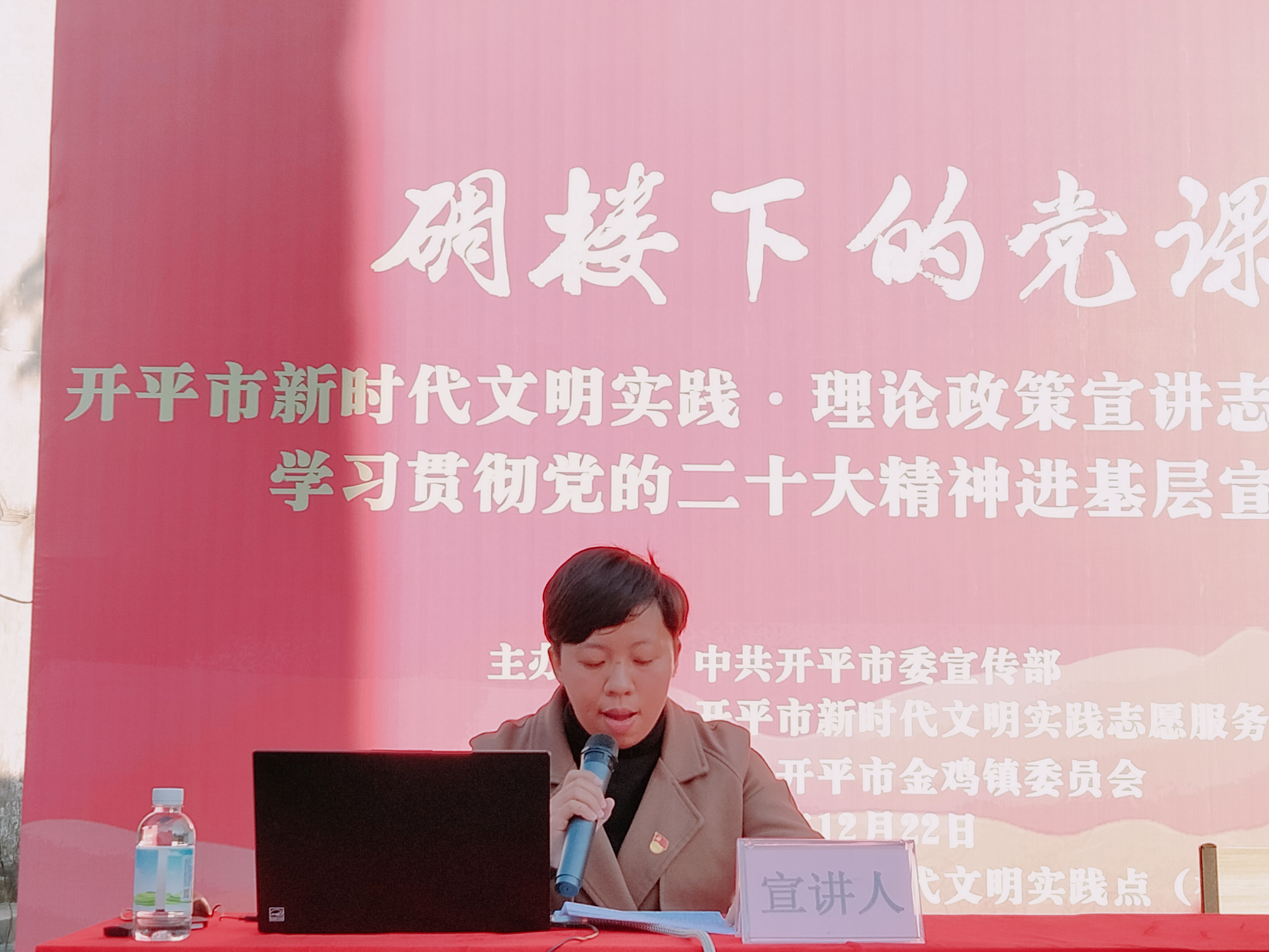 為推動(dòng)黨的二十大精神在基層落地落實(shí),12月22日下午,由市委宣傳部、市新時(shí)代文明實(shí)踐志愿服務(wù)總隊(duì)主辦,金雞鎮(zhèn)承辦的學(xué)習(xí)貫徹黨的二十大精神進(jìn)基層宣講會(huì)在金雞鎮(zhèn)錦湖村禮林學(xué)校舉行。鎮(zhèn)領(lǐng)導(dǎo)班子成員、各部門負(fù)責(zé)人、各村(社區(qū))書記共40多人參加了這次活動(dòng)。