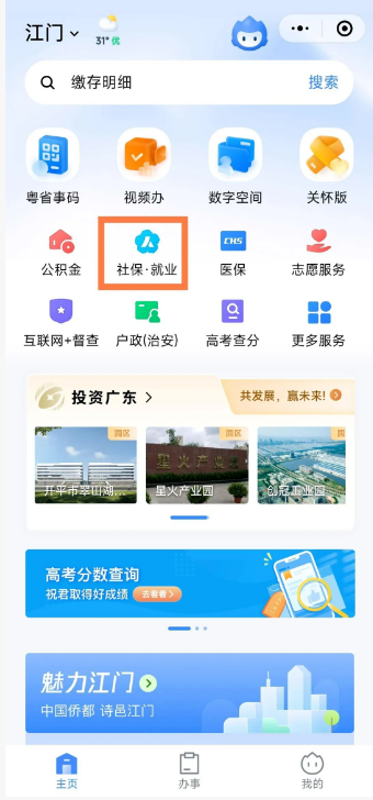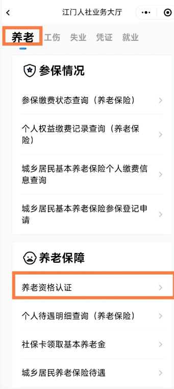 1.微信搜索“粵省事”小程序,選擇城市“江門”,點擊【社保·就業(yè)】;登錄后,點擊【養(yǎng)老】—【養(yǎng)老資格認證】—選擇對應服務類型;