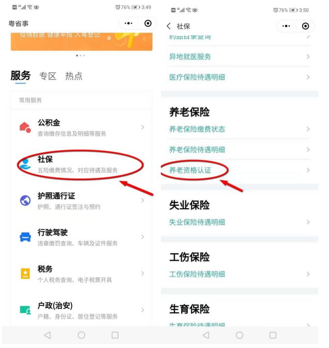 1.可辦理:企業(yè)職工養(yǎng)老保險(xiǎn)待遇資格認(rèn)證(即退休年審)業(yè)務(wù)。2.操作指引:參保人通過智能手機(jī)在微信上搜索“粵省事”小程序-在服務(wù)專區(qū)選擇“社保”板塊-點(diǎn)擊“登錄”,通過個(gè)人身份認(rèn)證后,選擇“養(yǎng)老保險(xiǎn)”-點(diǎn)擊“養(yǎng)老資格認(rèn)證”-點(diǎn)擊“城鎮(zhèn)職工社?!?點(diǎn)擊“本人辦理”或“為他人代辦”,并輸入對應(yīng)的姓名和身份證號碼-進(jìn)行人臉識別認(rèn)證。