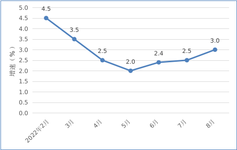 2022年2月以來我市規(guī)模以上工業(yè)增加值情況 二、投資 1-8月,全市完成固定資產(chǎn)投資同比下降14.7%。從分經(jīng)濟類型看,國有投資增長33.1%;民間投資下降11.5%。分產(chǎn)業(yè)看,第一產(chǎn)業(yè)投資下降48.2%;第二產(chǎn)業(yè)投資增長下降0.5%,其中工業(yè)投資下降0.5%;第三產(chǎn)業(yè)投資下降22.3%,其中房地產(chǎn)投資下降31.7%。 三、消費市場 1-8月,我市完成社會消費品零售總額118.17億元,同比增長3.0%。 圖二