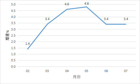 1-7月開平市經(jīng)濟(jì)運(yùn)行簡況 1-7月,全市主要經(jīng)濟(jì)指標(biāo)運(yùn)行簡況如下: 一、工業(yè)生產(chǎn) 1-7月,開平規(guī)模以上工業(yè)企業(yè)累計(jì)完成工業(yè)增加值74.62億元,同比增長3.4%。 分經(jīng)濟(jì)類型看,股份制企業(yè)增長11.6%;外商及港澳臺商投資企業(yè)下降3.7%;私營企業(yè)增長7.6%。分門類看,采礦業(yè)增加值下降23.8%,制造業(yè)增加值增長2.1%,電力、熱力、燃?xì)饧八a(chǎn)和供應(yīng)業(yè)增加值增長110.6%。 1-7月全市工業(yè)用電量增長7.8%。 圖一 2024年2月以來開平市規(guī)模以上工業(yè)增加值增速 二、投資 1-7月,全市完成固定資產(chǎn)投資同比增長5.3%。分經(jīng)濟(jì)類型看,國有投資下降17.4%,民間投資下降2.1%。分產(chǎn)業(yè)看,第一產(chǎn)業(yè)投資下降46.6%;第二產(chǎn)業(yè)投資增長5.3%,其中工業(yè)投資增長5.3%;第三產(chǎn)業(yè)投資增長6.5%,其中房地產(chǎn)投資下降11.0%。 三、消費(fèi)市場 1-7月,我市完成社會消費(fèi)品零售總額104.86億元,同比增長1.7%。 圖二 2024年2月以來開平市社會消費(fèi)品零售總額增速 四、財(cái)政收入 1-7月,全市實(shí)現(xiàn)地方一般公共預(yù)算收入15.22億元,同比增長2.8%,其中稅收收入8.75億元,同比下降8.9%。 五、金融市場 7月末,全市金融機(jī)構(gòu)本外幣各項(xiàng)存款余額949.61億元,同比增長6.5%;本外幣各項(xiàng)貸款余額701.47億元,同比增長9.8%。 六、外貿(mào)進(jìn)出口 1-7月,全市外貿(mào)進(jìn)出口總額93.0億元,同比增長7.9%。其中,進(jìn)口8.3億元,同比增長15.9%;出口84.7億元,同比增長7.2%。