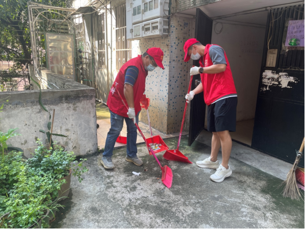 本次防控重點做好南島市場周邊人員密集區(qū)域的蚊蟲消殺和衛(wèi)生清潔工作。黨員義工們頂著炎炎烈日,手持清掃工具深入樓層樓道、街頭巷尾,對房屋周邊堆積的雜物、綠色植物隱蔽的垃圾、下水道淤積的污水進行全面清理。在行動過程中,黨員義工們還對居民家中的花盆、儲水容器等容易積水的地方及時清除;針對一些衛(wèi)生黑點,通過翻墻爬梯進行到底,深入清潔,清除的垃圾一袋接一袋、清理的積水一盆接一盆,盡最大的努力履行好防控責(zé)任和使命。