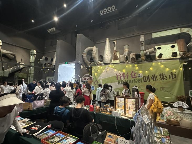 同日,“谷籽倉(cāng)”-KP.Market創(chuàng)業(yè)集市、2025新品發(fā)布會(huì)和“文創(chuàng)應(yīng)用多元化”主題圓桌會(huì)議相繼舉辦。在塘口鎮(zhèn)糧語(yǔ)藝術(shù)公社1號(hào)倉(cāng)內(nèi),“谷籽倉(cāng)”-KP.Market創(chuàng)業(yè)集市多個(gè)創(chuàng)意十足的創(chuàng)業(yè)攤位吸引了眾多游客駐足參觀(guān)、選購(gòu)。本次集市作為基地的創(chuàng)業(yè)社區(qū)共創(chuàng)共建的“新試驗(yàn)”,首次將集市與鄉(xiāng)村工業(yè)遺產(chǎn)結(jié)合,把集市帶進(jìn)舊廠(chǎng)房。而2025新品發(fā)布會(huì)連續(xù)2年作為基地為返鄉(xiāng)創(chuàng)業(yè)者打造的宣傳推廣平臺(tái),為11名創(chuàng)業(yè)者接近20個(gè)最新產(chǎn)品提供了展示的渠道。主題圓桌會(huì)議則在基地中廳由創(chuàng)業(yè)導(dǎo)師和創(chuàng)業(yè)者近40人共同探討了“文創(chuàng)應(yīng)用多元化”的主題,圍繞真實(shí)案例,深入剖析了文創(chuàng)產(chǎn)品的多元消費(fèi)場(chǎng)景,不僅限于旅游紀(jì)念品,更可以融入到日常生活和文化消費(fèi)領(lǐng)域。