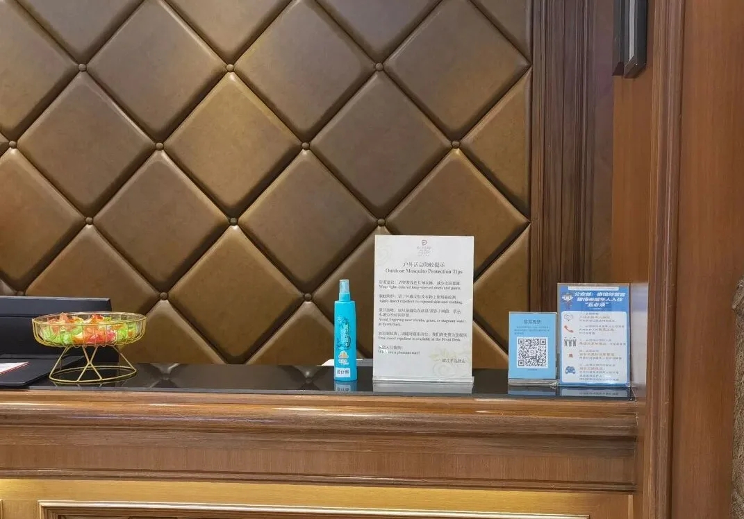 這一幕井然有序的場景,背后是酒店細(xì)致的防蚊舉措。開平潭江半島酒店相關(guān)負(fù)責(zé)人介紹,該酒店堅守“安全第一 賓客至上”承諾,從源頭開展蚊蟲防控,組織工作人員對酒店全域進(jìn)行翻盆倒罐式清理,徹底清除積水、落葉、雜物等,同時,疏通下水道、清理水生綠植,對酒店所有下水道入口安裝四防裝置。此外,全面檢修防蚊紗窗、門簾及風(fēng)幕機(jī),公共區(qū)域搭配環(huán)保驅(qū)蚊劑與滅蚊燈,客房內(nèi)備好電蚊香液,同時與專業(yè)消殺公司合作,實現(xiàn)酒店內(nèi)外全域常態(tài)化消殺?!拔覀儾扇×硕喾N防蚊措施。在酒店大堂及前臺區(qū)域設(shè)置了防蚊提示牌,每個客房都放置了防蚊宣傳單。同時,每個房間和前臺都配備了防蚊劑,供客人使用。此外,還利用酒店公共區(qū)域的顯示屏等平臺,開展防蚊宣傳工作。” 酒店副總經(jīng)理潘宗明說道。