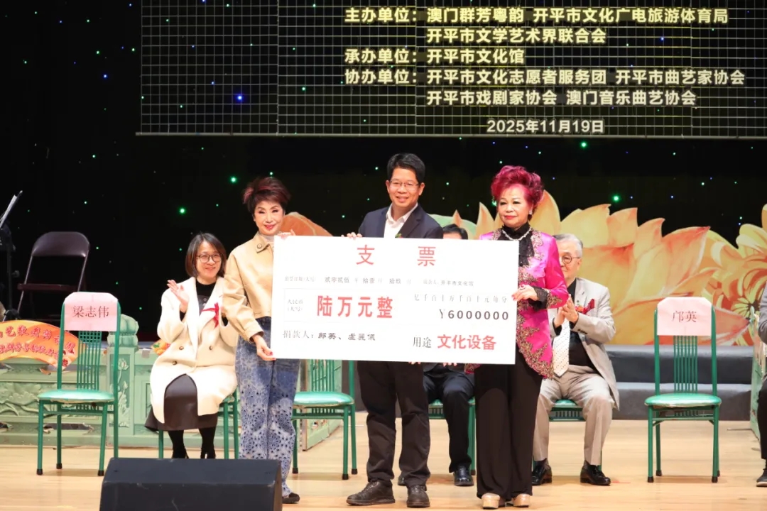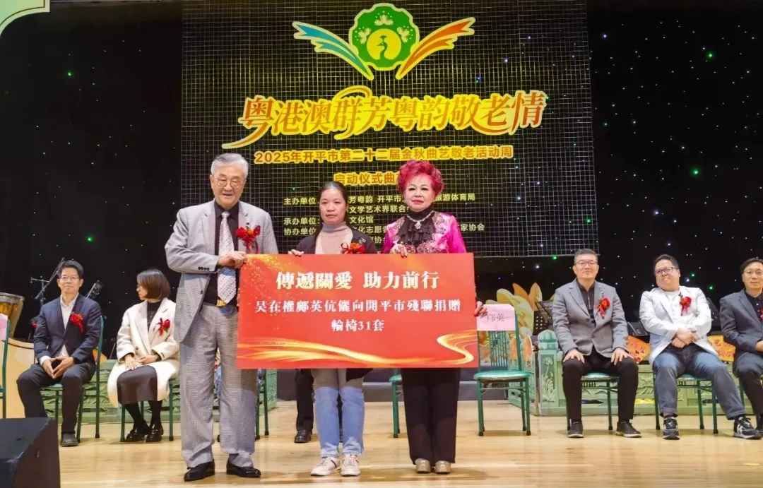 本次曲藝晚會(huì)由澳門群芳粵韻、開平市文廣旅體局、開平市文聯(lián)聯(lián)合主辦。儀式上,澳門鄉(xiāng)親鄺英、澳門同胞盧麗儀向開平捐贈(zèng)6萬元,用于購買文化設(shè)備。同時(shí),活動(dòng)現(xiàn)場還舉行了“傳遞關(guān)愛 助力前行”輪椅捐贈(zèng)儀式,澳門原第三第四屆立法會(huì)議員,澳門房地產(chǎn)聯(lián)合商會(huì)會(huì)長吳在權(quán)、鄺英伉儷向開平捐贈(zèng)31套愛心輪椅?;顒?dòng)最后,澳門鄉(xiāng)親鄺英和盧麗儀女士還為在場觀眾送上澳門特色禮品與紅包,傳遞敬老溫情。