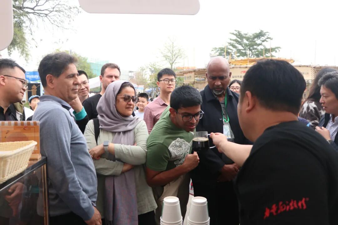 在大賽配套活動中,外國友人現(xiàn)場品咖啡、逛市集,了解先進咖啡設(shè)備,并在“即學(xué)即會”手沖咖啡公益課上體驗咖啡沖煮。