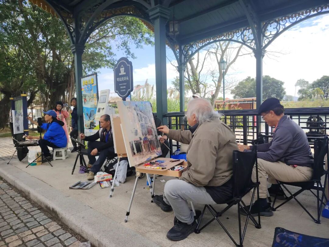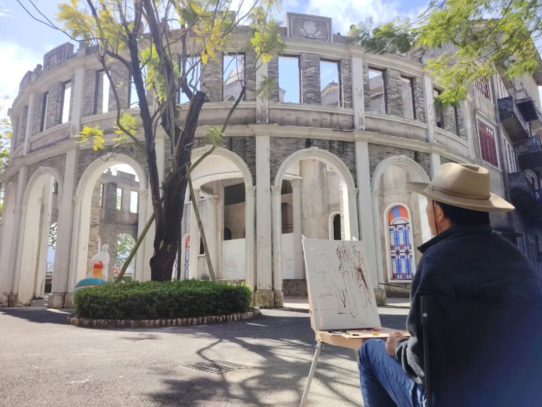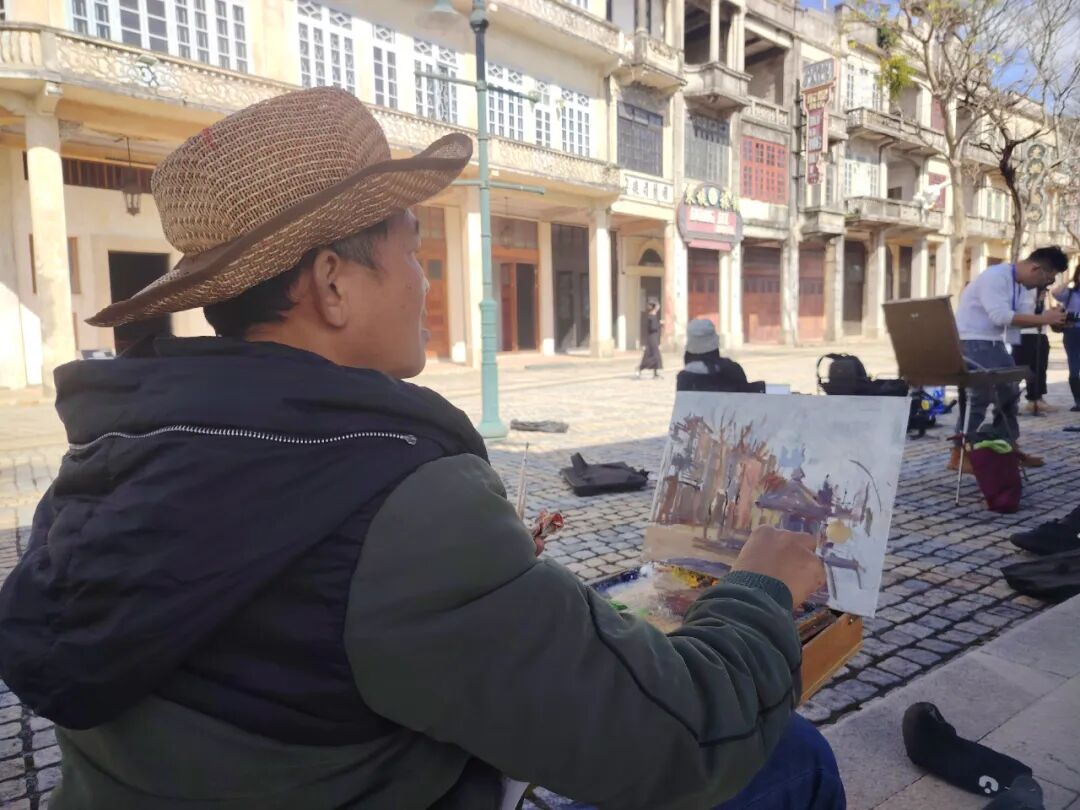 啟動儀式后,美術家們迅速進入創(chuàng)作狀態(tài)。在赤坎華僑古鎮(zhèn),大家分散于街巷各處,尋找自己心儀的視角,有人面對連片騎樓鋪展畫布,以油彩勾勒建筑風貌;也有畫家執(zhí)筆揮墨,以流暢線條捕捉市井煙火,力圖展現(xiàn)僑鄉(xiāng)建筑中西合璧的獨特神韻。