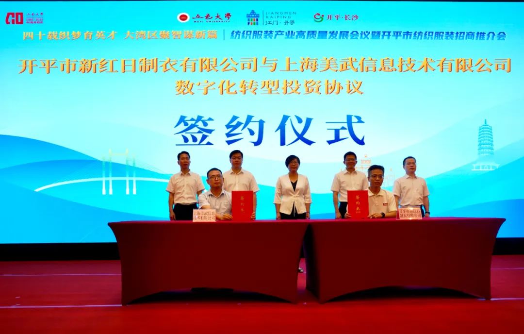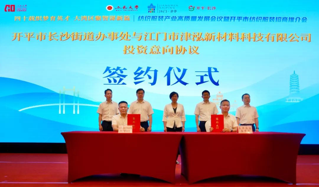 在現(xiàn)場舉行的簽約儀式上,五邑大學紡織科學與工程學院與開平市紡織服裝行業(yè)協(xié)會簽訂人才培養(yǎng)戰(zhàn)略合作協(xié)議;長沙街道辦事處與江門市津泓新材料科技有限公司簽訂投資意向協(xié)議;開平市新紅日制衣有限公司與上海美武信息技術有限公司簽訂數(shù)字化轉型投資協(xié)議,為開平紡織產(chǎn)業(yè)人才儲備、技術升級及全鏈條高質量發(fā)展注入強勁動能。