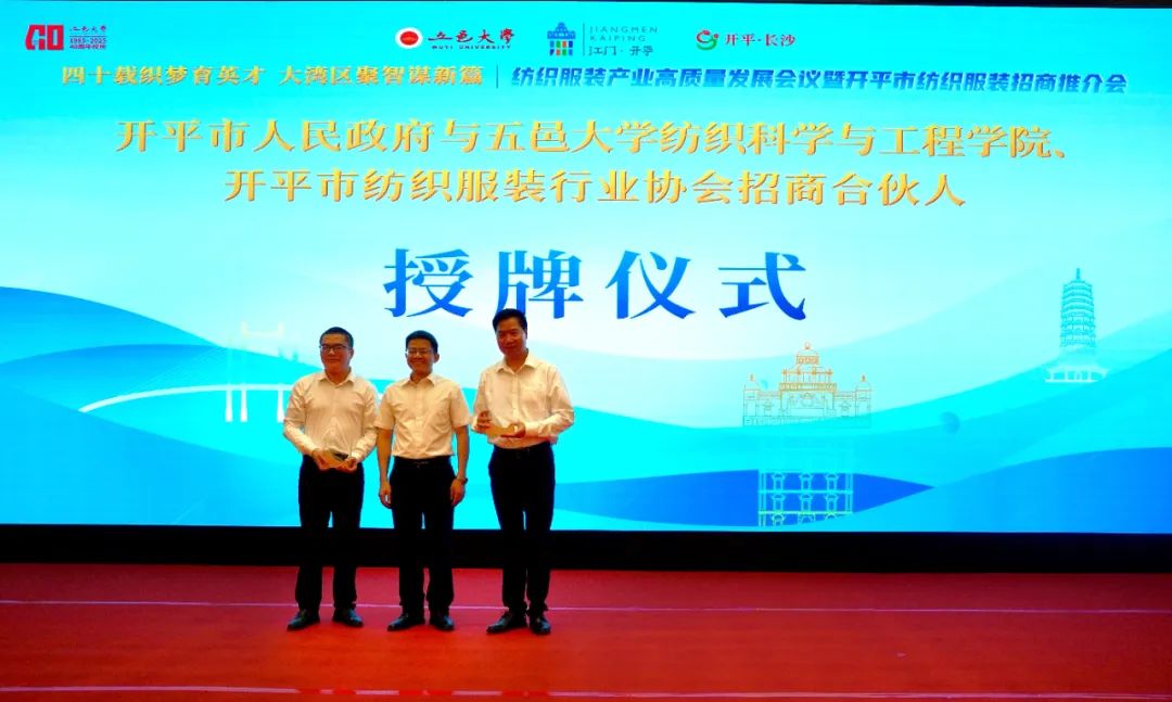 同時,開平市向五邑大學紡織科學與工程學院、開平市紡織服裝行業(yè)協(xié)會授予“招商合伙人”牌匾,精準賦能開平紡織產(chǎn)業(yè)鏈招商;五邑大學向開平市紅日制衣有限公司授予“五邑大學校外實習基地”牌匾,進一步促進人才培養(yǎng)與實踐教學的雙向融合。