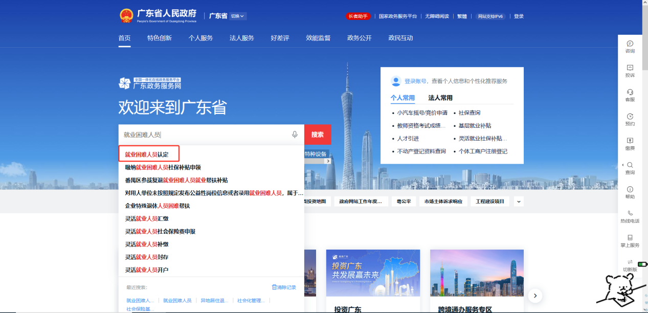 1.網(wǎng)上辦理:線上訪問“廣東政務(wù)服務(wù)網(wǎng)”(https://www.gdzwfw.gov.cn),搜索“就業(yè)困難人員認(rèn)定”,點(diǎn)擊“在線辦理”。