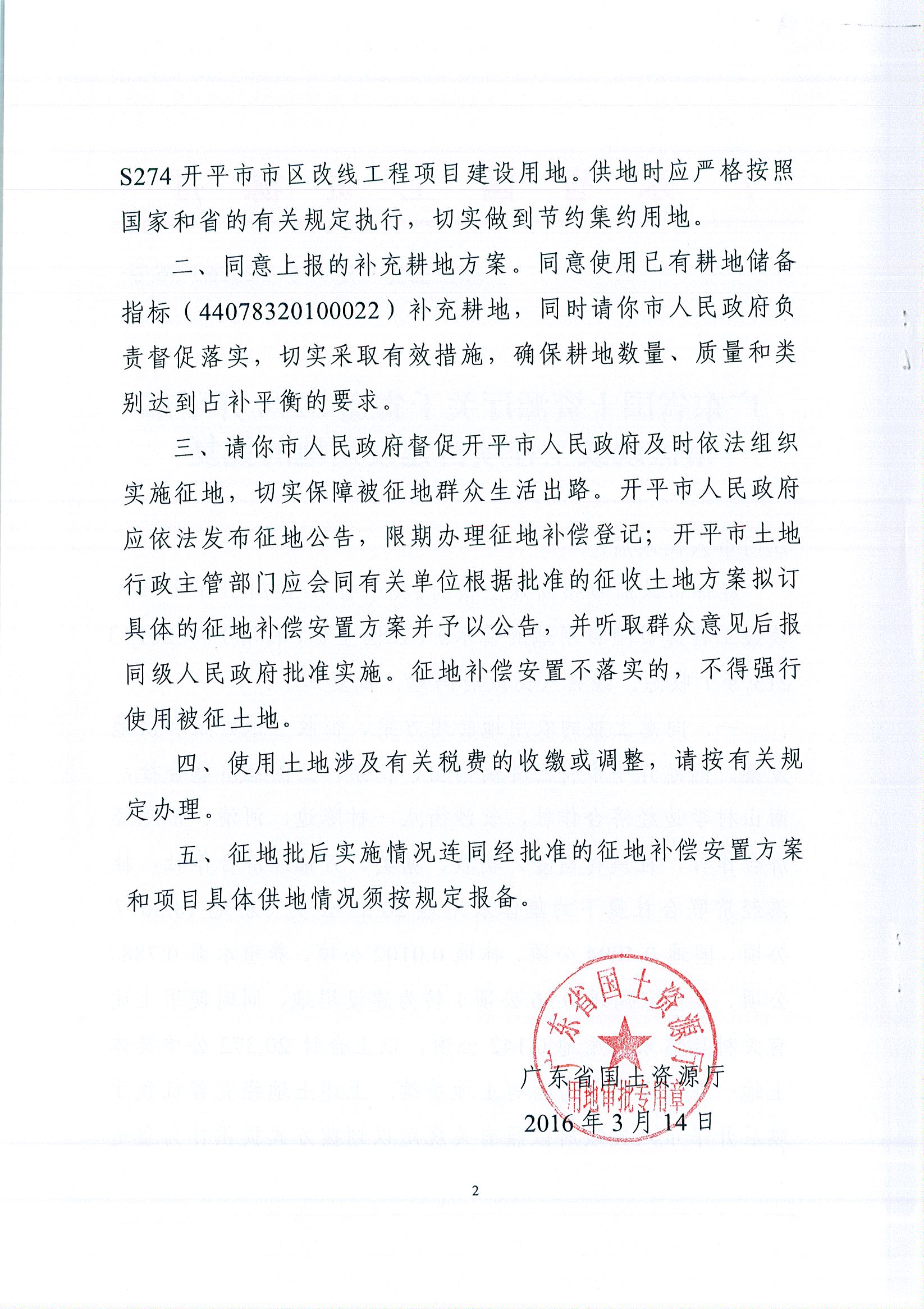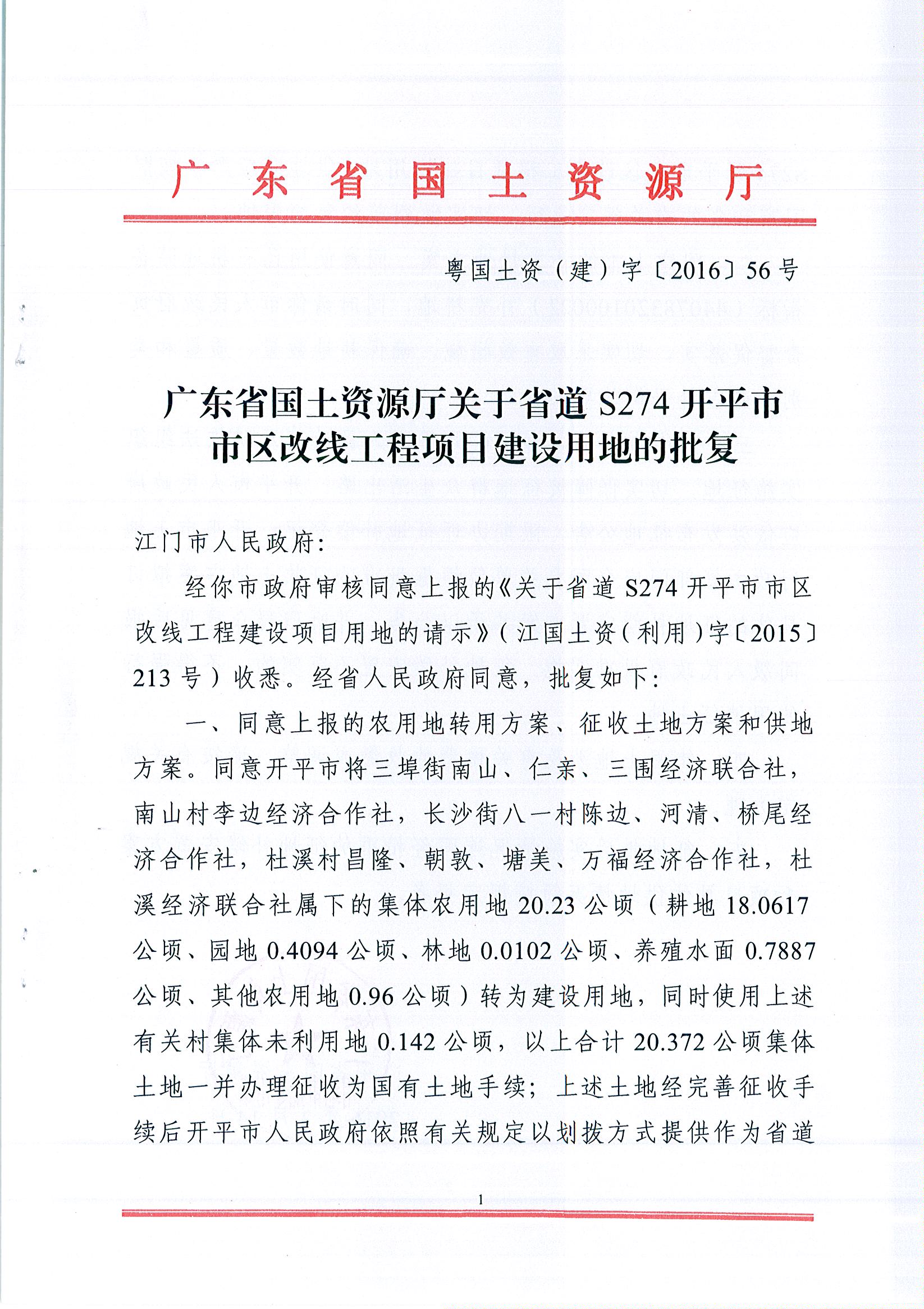 廣東省國土資源廳關(guān)于省道S274開平市市區(qū)改線工程項(xiàng)目建設(shè)用地的批復(fù)