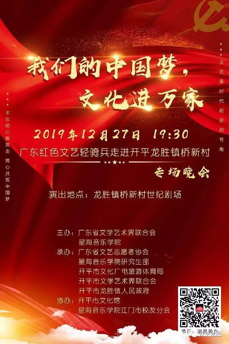 12月27日晚,廣東紅色文藝輕騎兵將走進開平市龍勝鎮(zhèn)橋新村舉辦歌聲嘹亮70年文藝晚會。星海音樂學院將呈現精彩演出,節(jié)目涵蓋了舞蹈、戲曲、歌劇、樂器演奏等系列文藝精品。把精彩紛呈的節(jié)目帶給群眾,讓老百姓在濃濃的藝術氛圍中感受著文化下基層帶來的暖意。 演出時間:2019年12月27日 19:30 演出地點:龍勝鎮(zhèn)橋新村世紀劇場 精彩的節(jié)目單請戳這,點開有驚喜: (掃描二維碼獲?。?/p>
