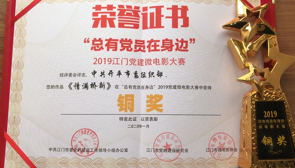 另外,還在去年10-11月參與“不忘初心、牢記使命”主題教育微視頻作品征集活動中,被人民網(wǎng)推廣展播。去年10月19日,被江門市黨建辦選在江門大地電影院舉行觀影活動。近日,又在2019年江門黨建微電影大賽中獲獎,屢獲殊榮,說明了該微電影作品選材好,整體質(zhì)量高。