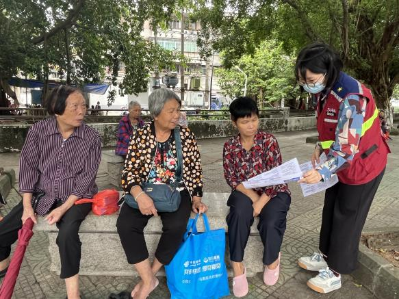 ▲社工向老年人科普防范電信詐騙知識(shí)