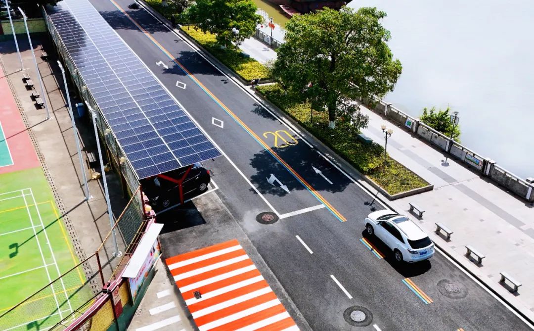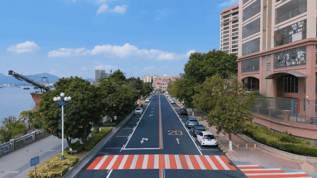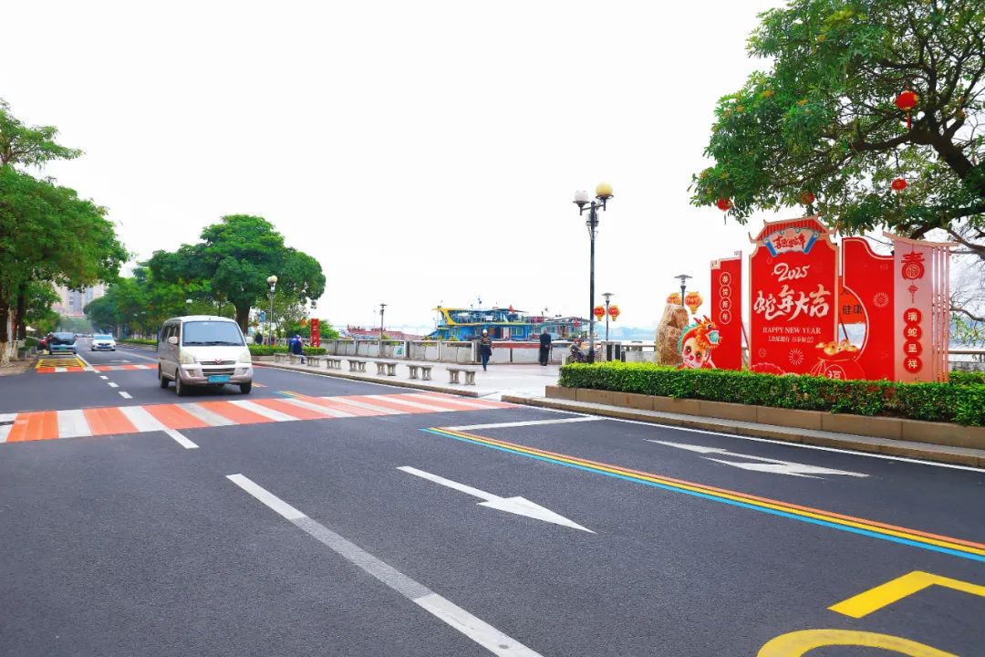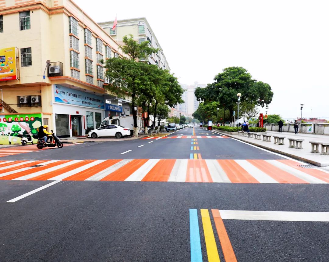 (三)施劃三色標(biāo)線。此次路面升級(jí)工程中,新鋪設(shè)的超350平方米的藍(lán)、黃、橙三色地面標(biāo)線和紅白斑馬線令人耳目一新。更具辨識(shí)度的三色標(biāo)線,比傳統(tǒng)標(biāo)線引導(dǎo)能力更強(qiáng),既確保了行人與車輛的安全通行,又與道路兩側(cè)綠化美化相得益彰,構(gòu)建了獨(dú)具特色的“彩虹公路”景觀。