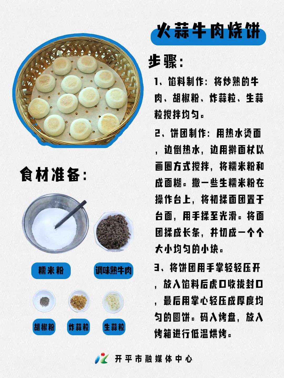 燒餅作為開(kāi)平一種傳統(tǒng)美食,承載著開(kāi)平人深厚的情感和歷史記憶。它是開(kāi)平人祭祖時(shí)必不可少的食品,每一個(gè)燒餅都蘊(yùn)含著家鄉(xiāng)的味道和濃濃的親情。而這道火蒜牛肉燒餅更是將傳統(tǒng)與創(chuàng)新完美結(jié)合。材料選用糯米粉、牛肉和火蒜,看似簡(jiǎn)單的食材組合,卻蘊(yùn)含著無(wú)限的可能。