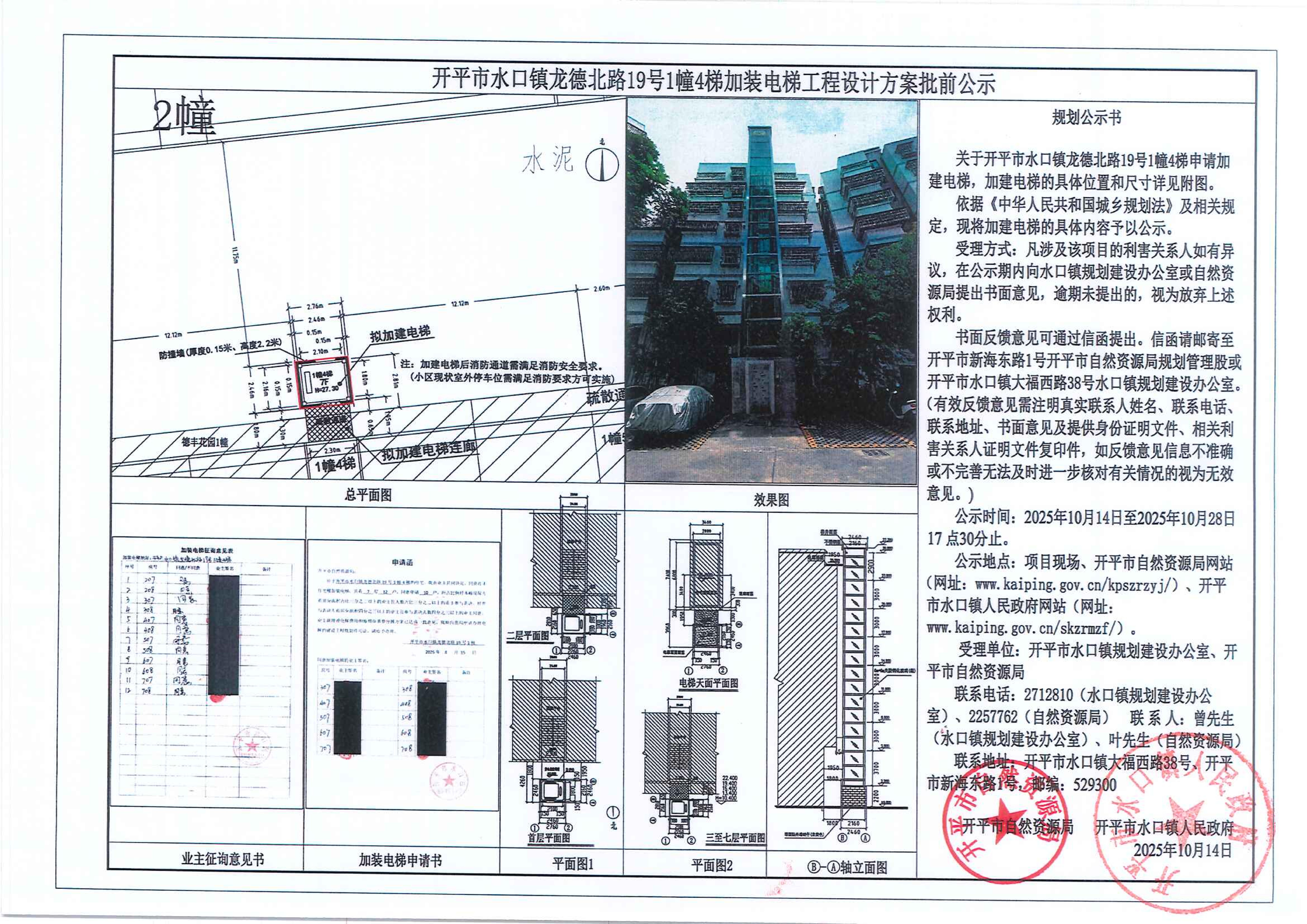 關(guān)于開平市水口鎮(zhèn)龍德北路19號(hào)1幢4梯申請(qǐng)加建電梯,加建電梯的具體位置和尺寸詳見附圖。