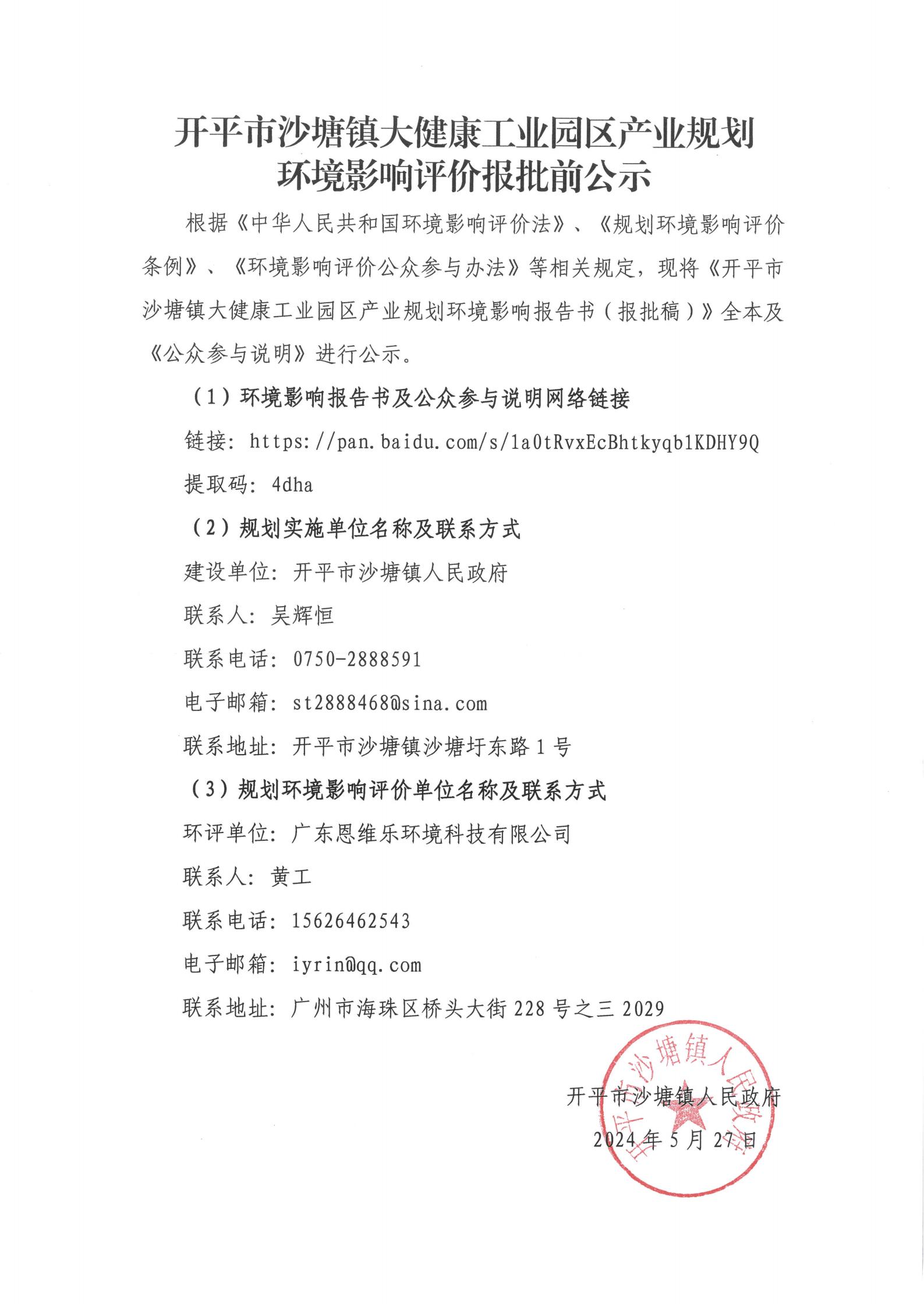 根據(jù)《中華人民共和國環(huán)境影響評價法》、《規(guī)劃環(huán)境影響評價條例》、《環(huán)境影響評價公眾參與辦法》等相關規(guī)定,現(xiàn)將《開平市沙塘鎮(zhèn)大健康工業(yè)園區(qū)產業(yè)規(guī)劃環(huán)境影響報告書(報批稿)》全本及《公眾參與說明》進行公示。